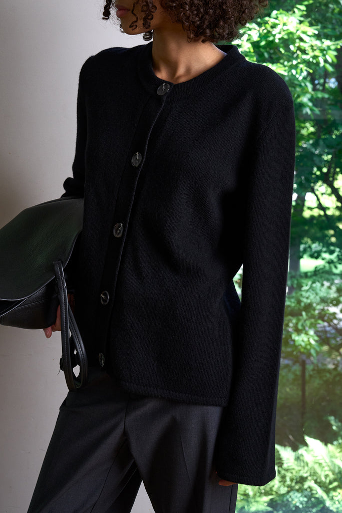 A clean, sculptural knit. The Elise Cardigan is made from 100% soft wool and shaped with a round neckline, wide sleeves and tonal horn buttons. Easy to wear with trousers, denim or a soft skirt — at work or off duty.