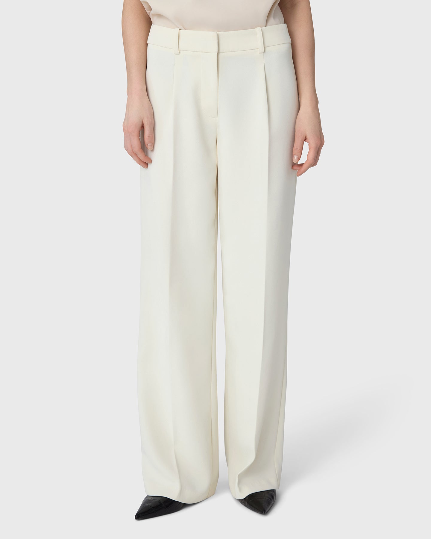 Zeitlose Hosen mit weitem Bein und eleganten vorderen Falten, die eine klare Silhouette bewahren, ohne Volumen hinzuzufügen. Gefertigt aus unserem charakteristischen schweren Stretch-Crêpe – einem maschinenwaschbaren Stoff, der knitterresistent ist und wunderschön fällt. Die perfekten cremefarbenen Hosen, zu denen Sie Saison für Saison zurückkehren werden.