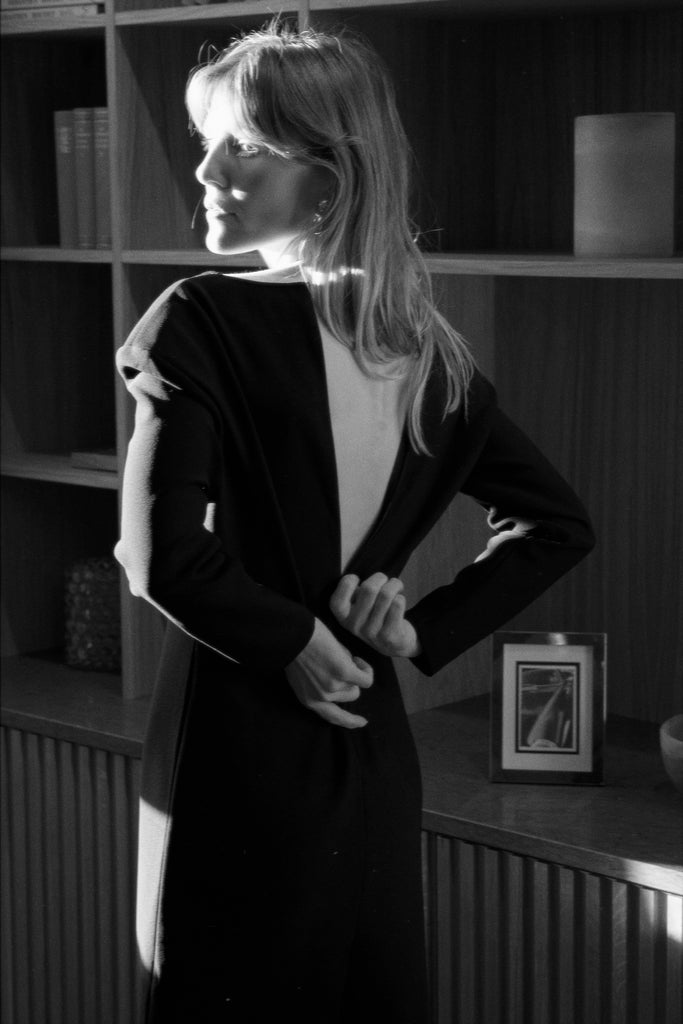 Bold and minimal. The Valerie Dress is made from sculpting superstretch jersey crepe with a deep V neckline, long sleeves and defined shoulders. A clean silhouette that makes a quiet statement — elegant from every angle.