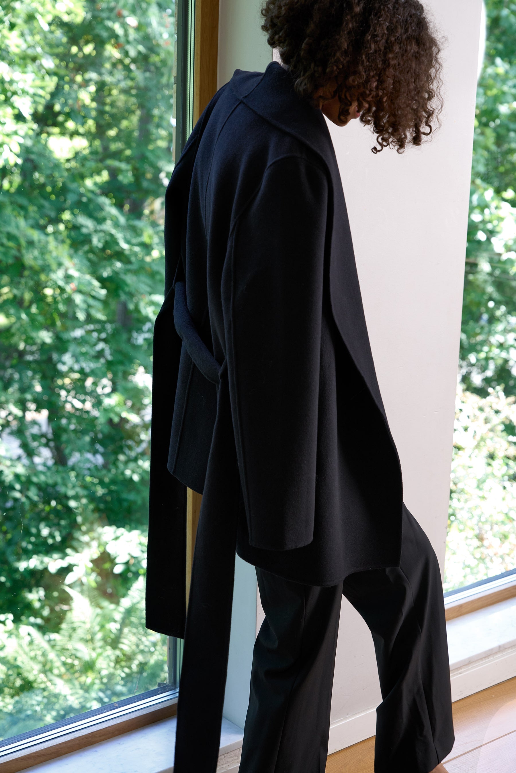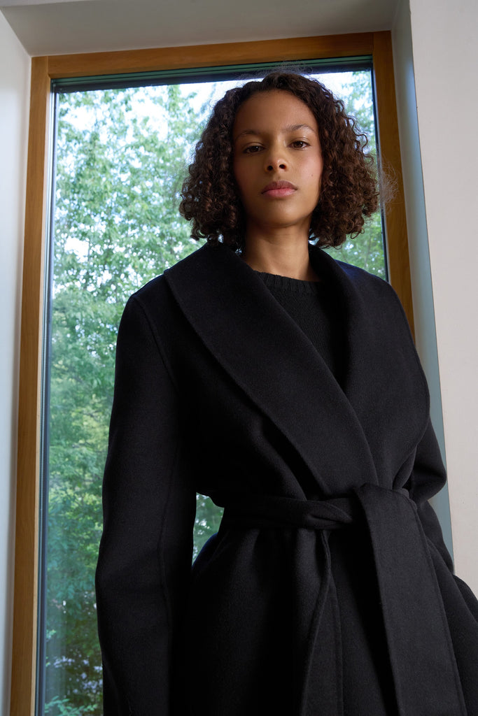 Minimal and softly structured. The Nina Coat is crafted from 100% soft wool with a shawl collar and sculpted seams for a feminine shape. The matching belt cinches the waist, while the hip-length cut makes it ideal for layering.