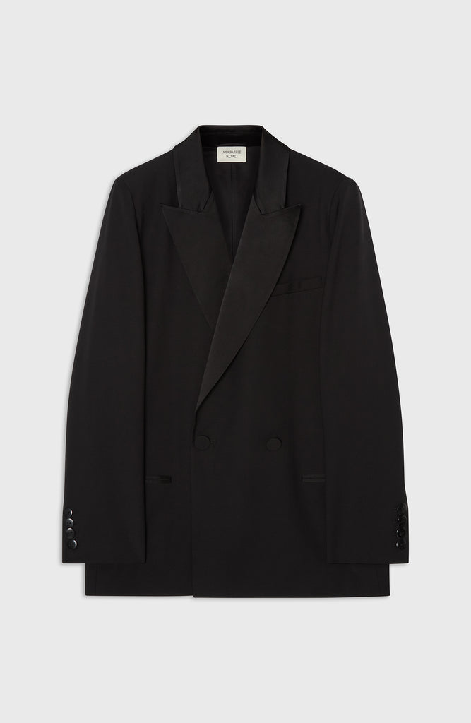 Sharp, modern and quietly dramatic. The Tuxedo Blazer is tailored in wool stretch with sleek satin lapels and a single button closure. The clean cut makes it easy to pair with matching trousers, denim or flowing satin — a statement in any combination.