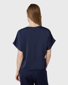 The Mia Satin Top is a short-sleeved top with a round neckline and a slightly fitted shape. In satin stretch with a decorative seam, pair with the matching Rhonda Satin Skirt or denim.