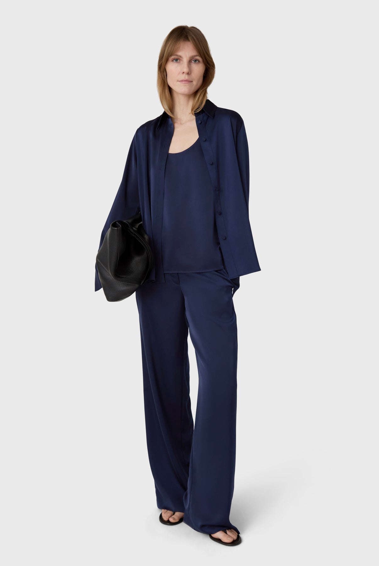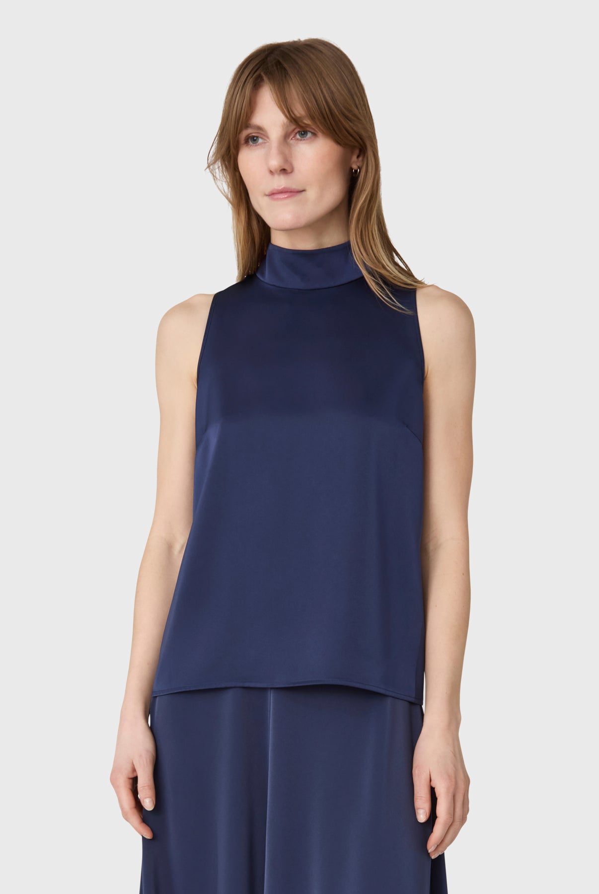 The Rhonda Satin Skirt is an ankle-length skirt in satin stretch with a softly draped silhouette. A subtle front seam adds a clean, refined expression. Pair with the matching Mia Satin Top for a cohesive look, or style with a simple tank for understated ease.