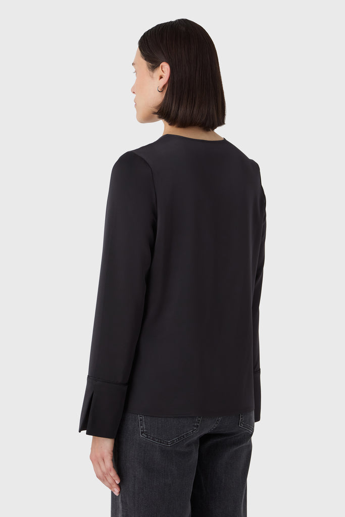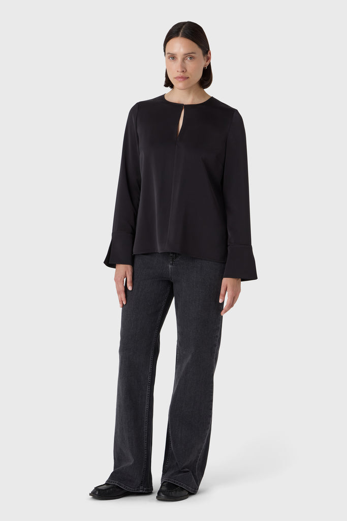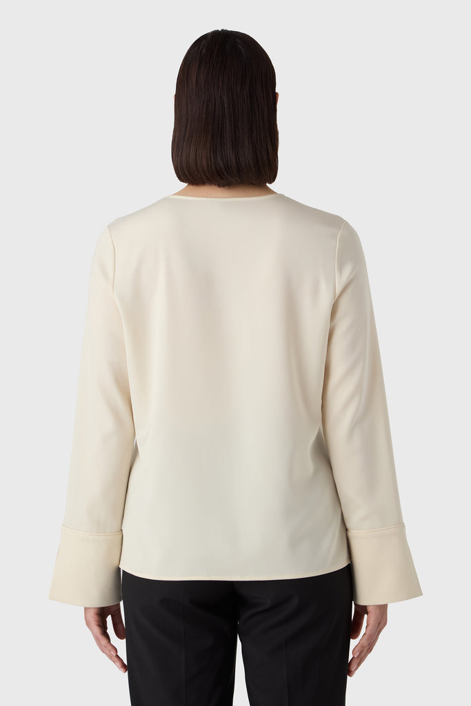 A timeless wardrobe essential with a soft twist. The Angela Blouse is cut from fluid satin stretch and features a rounded neckline with a feminine slit at the front. The subtle cuffs add a tailored finish to the relaxed silhouette, making it ideal for both professional settings and off-duty days. Tuck it into trousers or wear it loose for understated elegance.