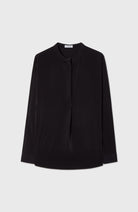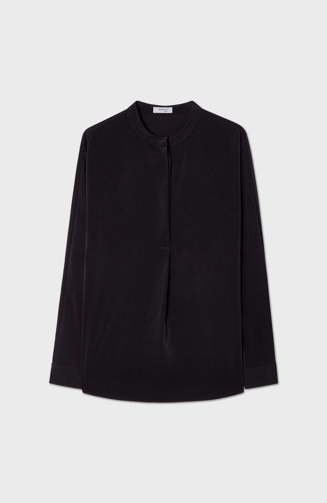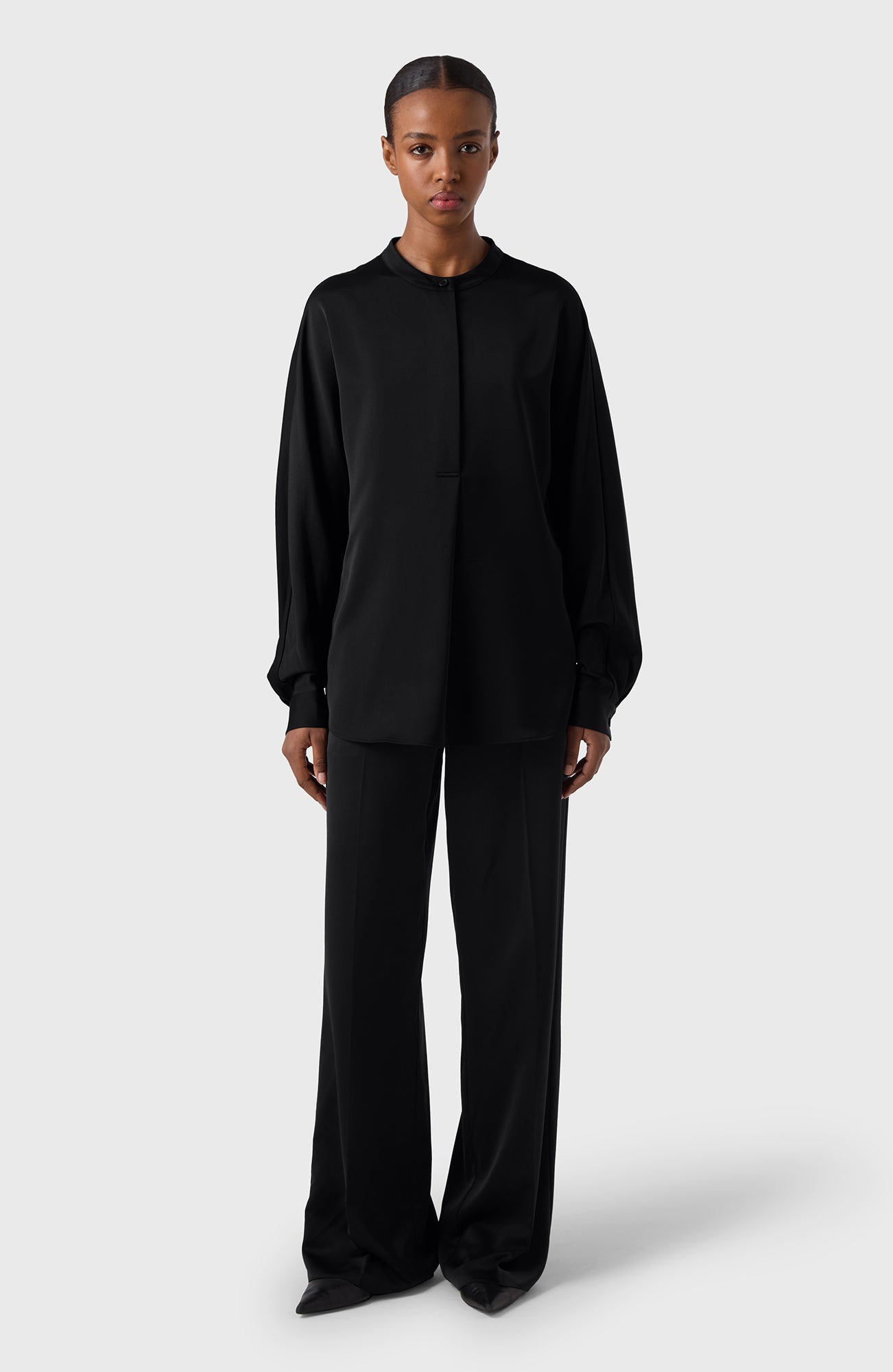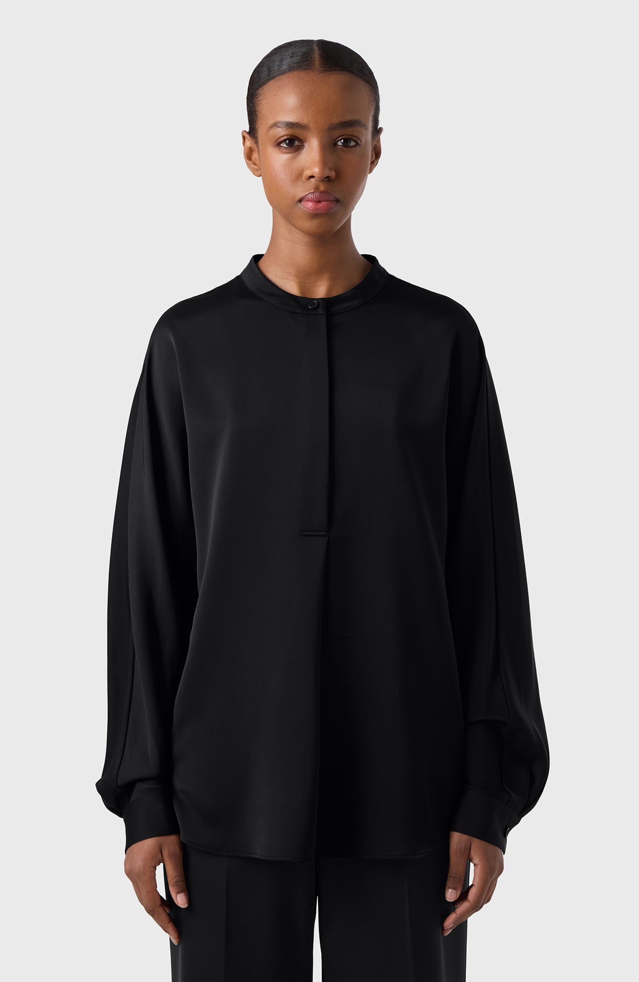 Long-sleeved blouse in soft satin stretch, featuring a round neckline, mother-of-pearl buttons, and gently rounded side hems. Designed with a feminine silhouette that flatters and feels effortless.