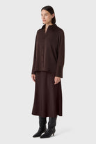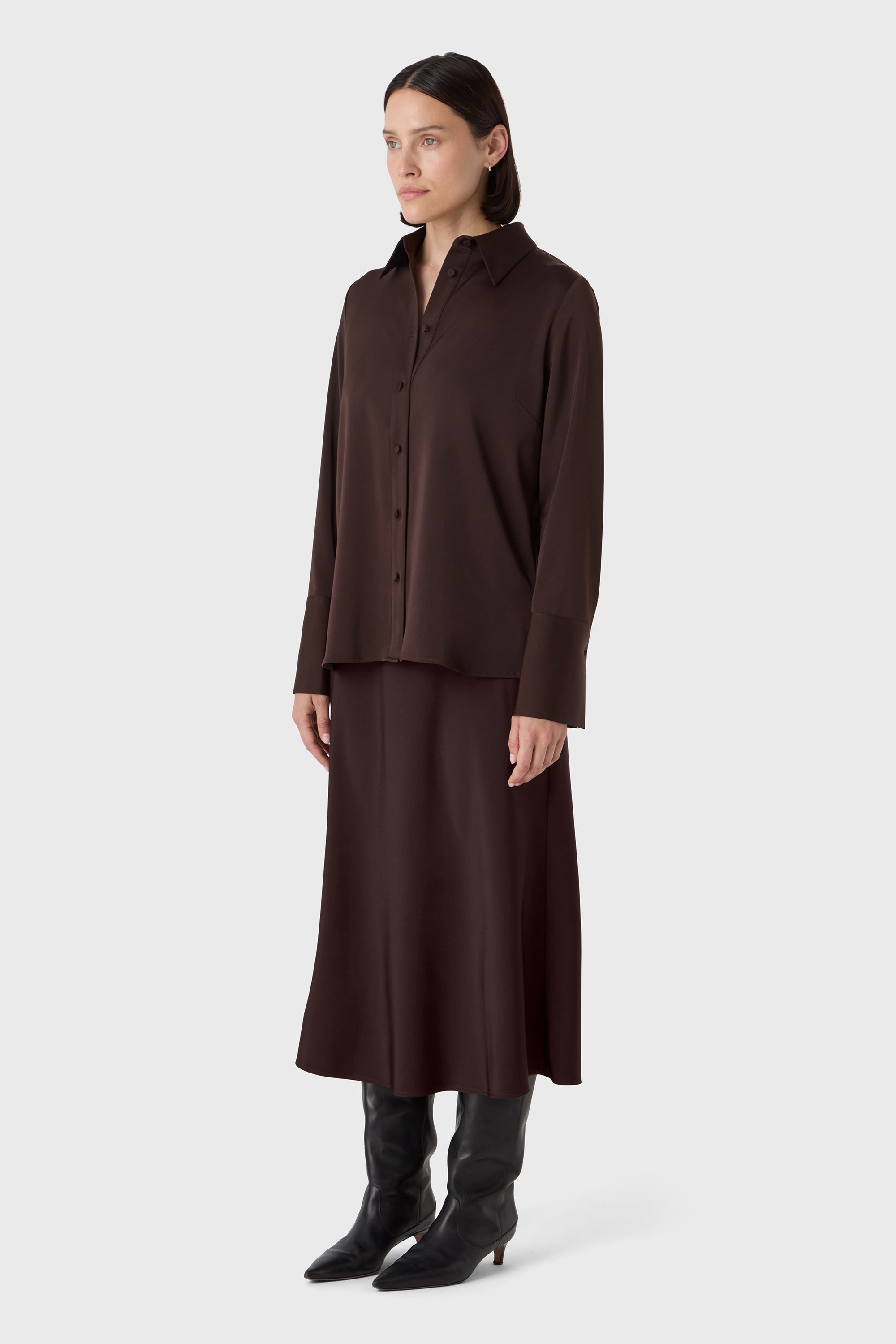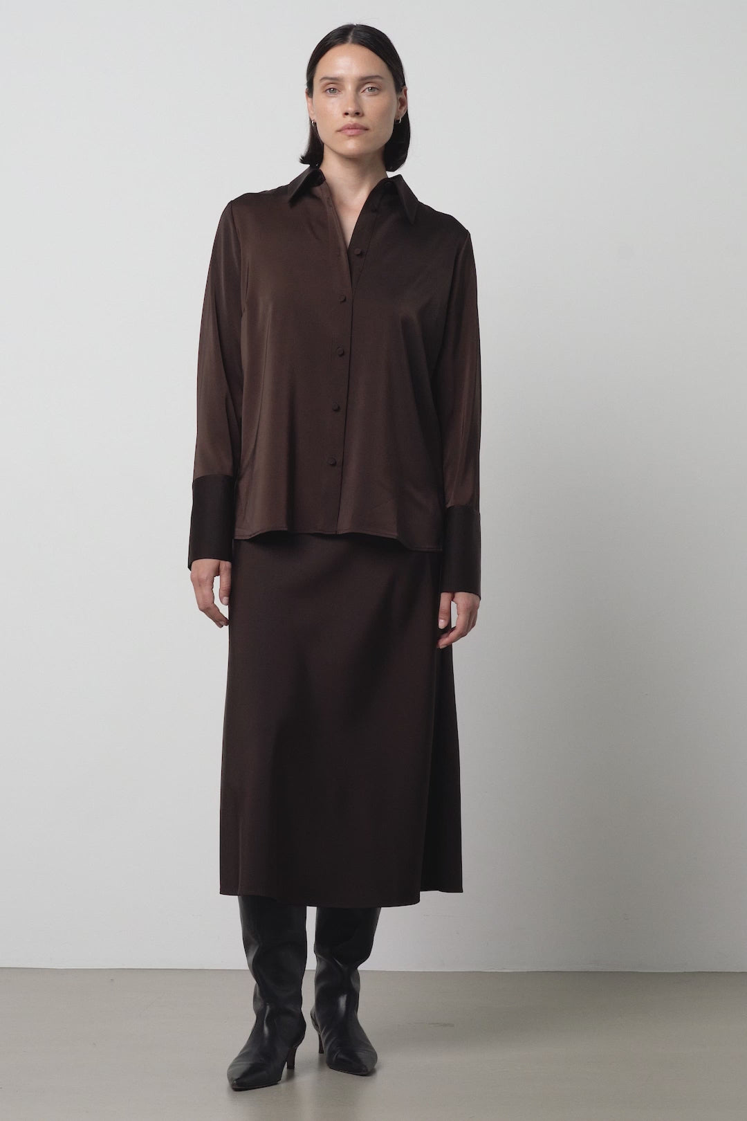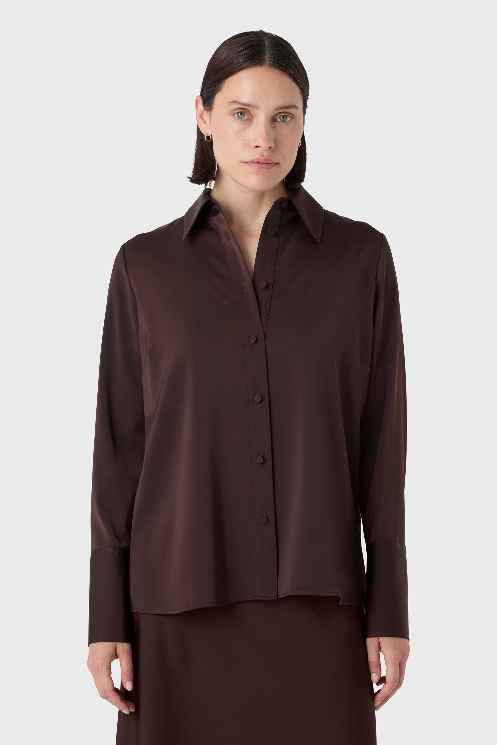 Soft structure with a touch of shine. The Leonie Blouse is a feminine take on the classic shirt — designed in satin stretch with long sleeves, decorative cuffs and fabric-covered buttons. A polished piece that pairs effortlessly with tailored trousers or soft knits.