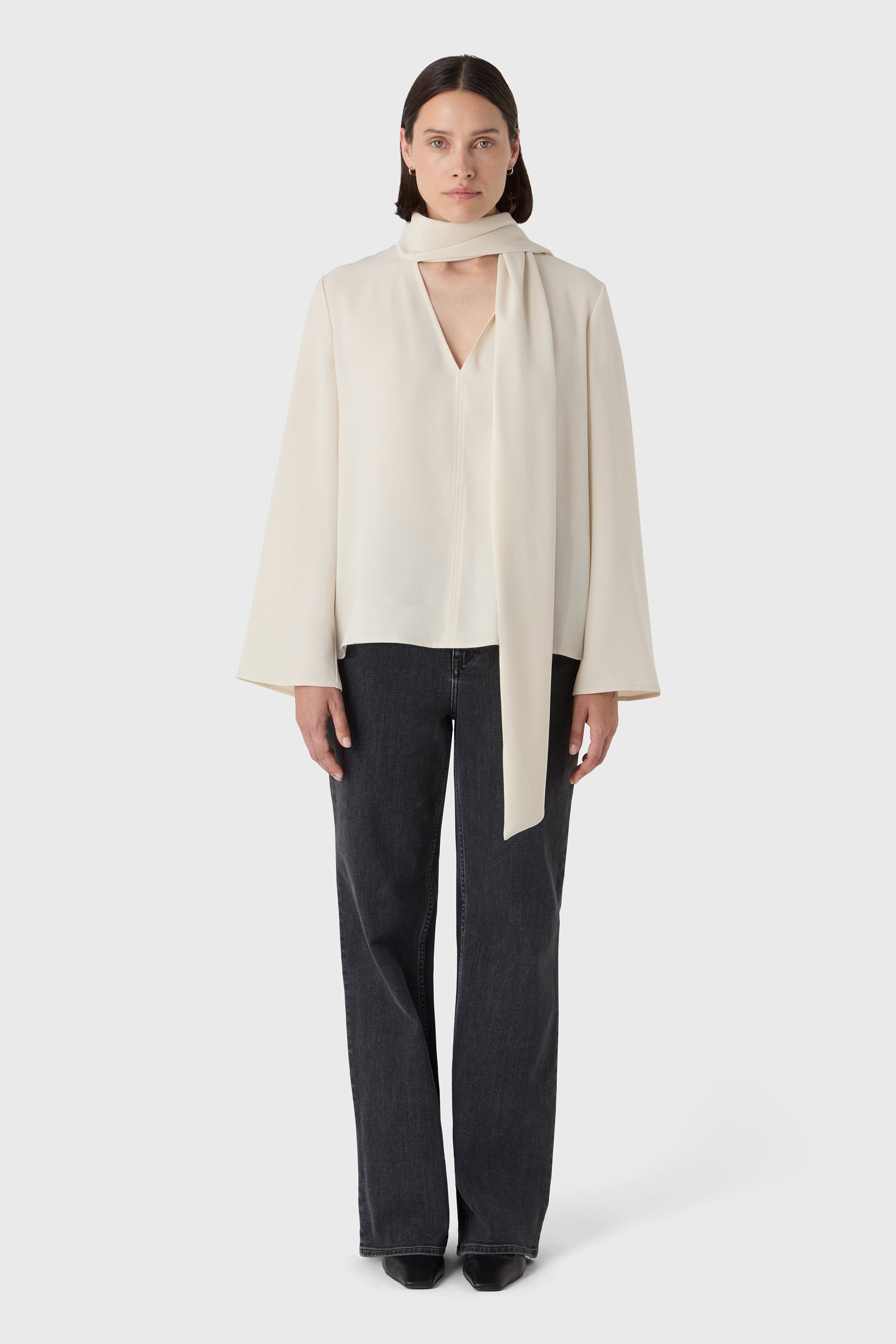 Effortless elegance with a twist. The Renée Blouse is made from soft poly twill and features long sleeves, a fluid drape and a generous shawl collar that can be styled in multiple ways. Tie it as a bow, let it fall freely, or wrap it around — it adapts to your day.