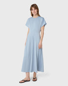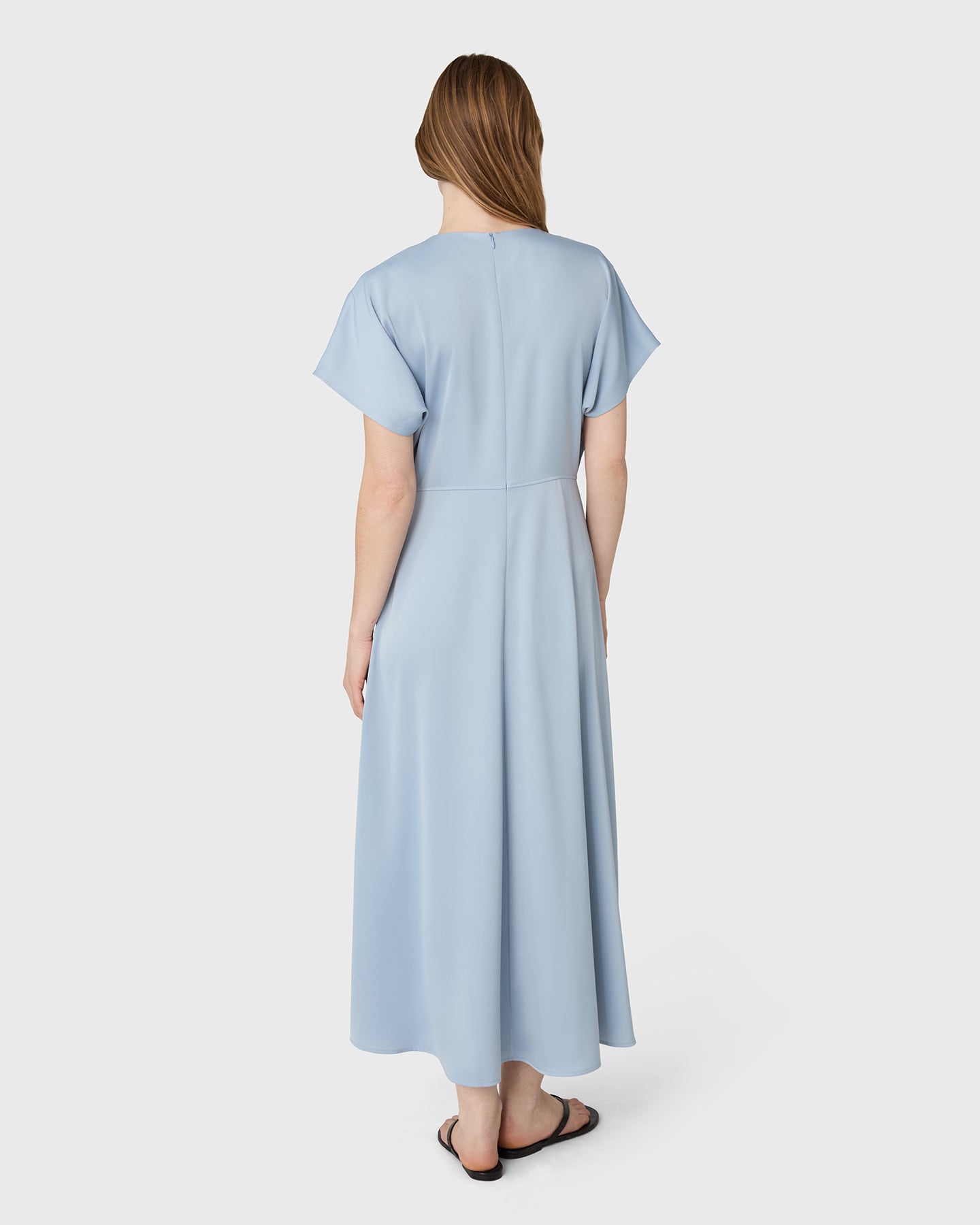 Designed to move with ease and elegance. The Rhonda Dress features a soft round neckline, short sleeves and a flowing, flared skirt. The front seams sculpt the silhouette, adding a subtle tailored feel to the fluid design. Cut in satin stretch for comfort and polish from day to night, the dress falls to ankle length.