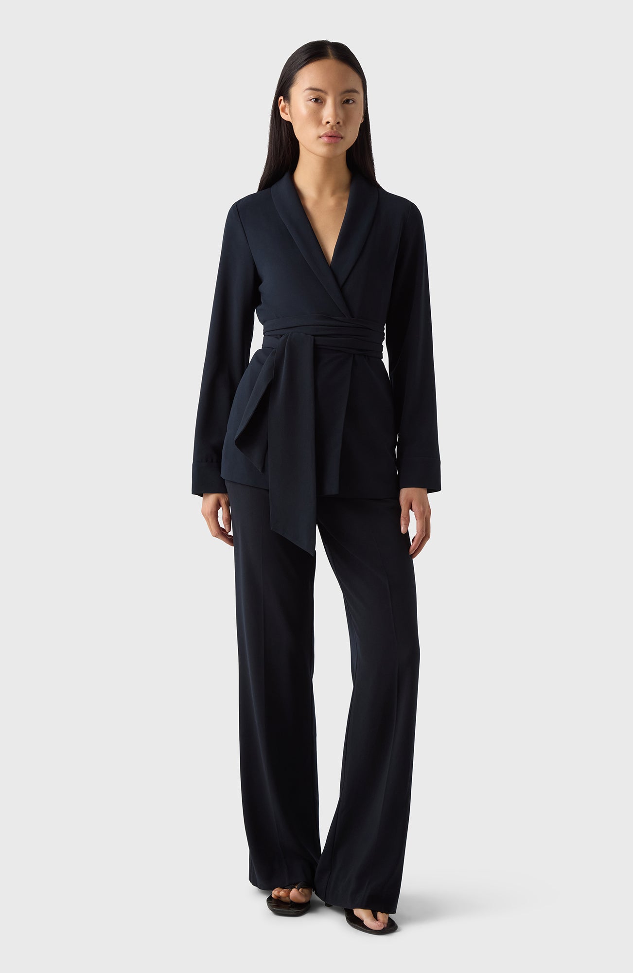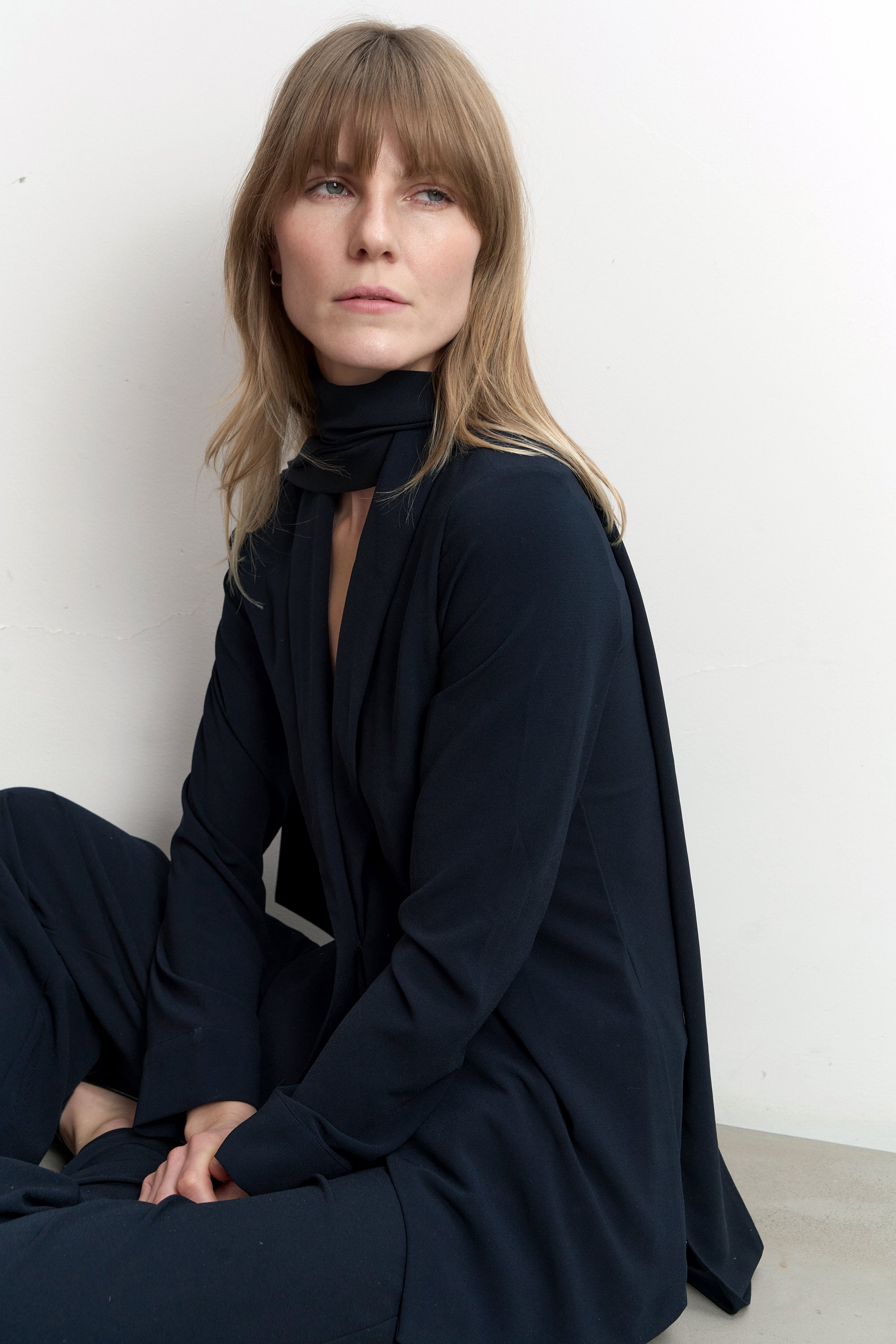 Varje garderob behöver en lätt och elegant kavaj som denna. Den kan bäras knäppt eller omlott och är gjord av ett mjukt crêpe-tyg. Kommer med ett tillhörande sjal/bälte.