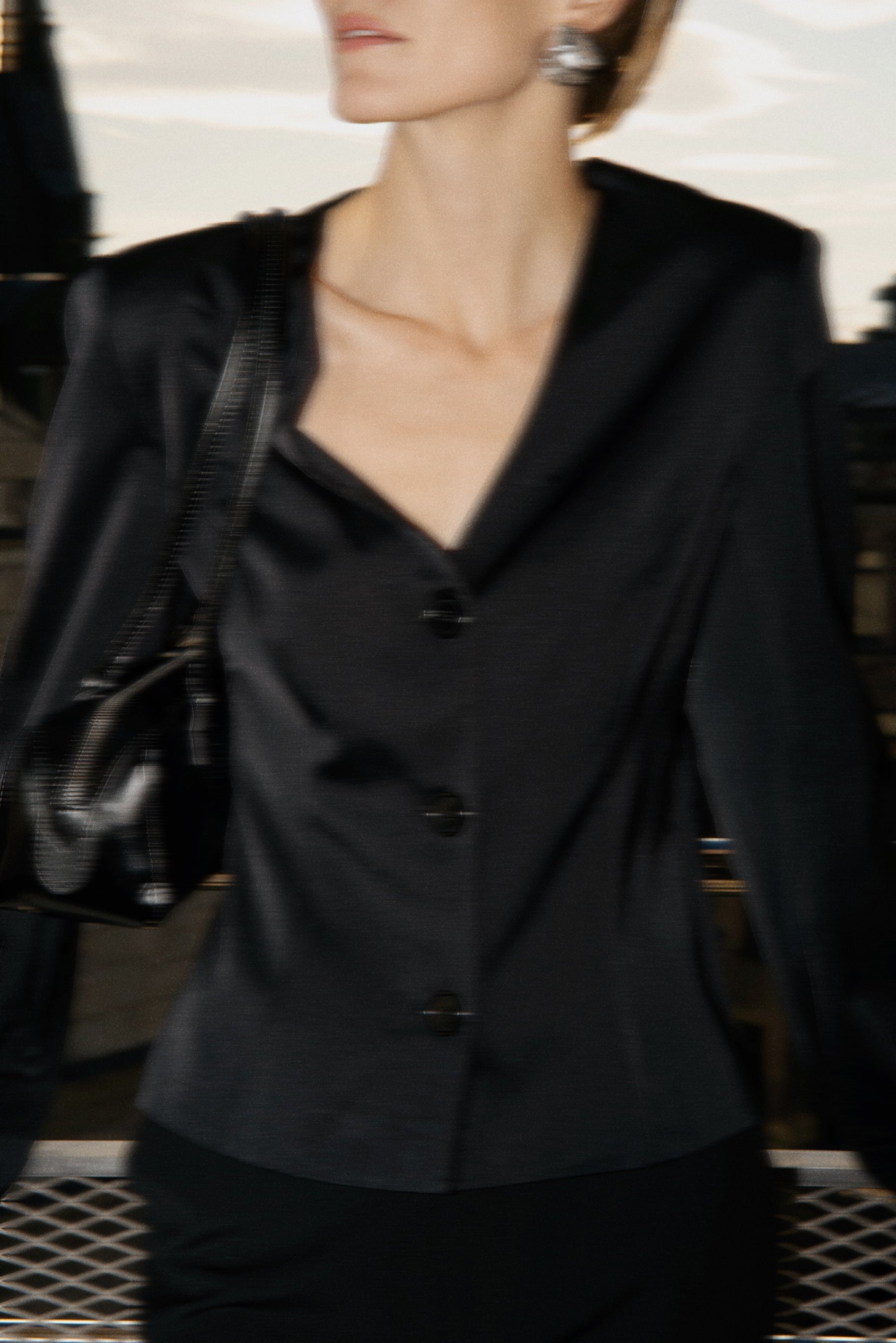 Li-kavajen har V-ringning, insvängd midja och hellånga ärmar som skapar en modern och feminin silhuett. De diskreta knapparna ger en elegant detalj till den i övrigt avskalade designen – bär som kostym eller som ensam statement.