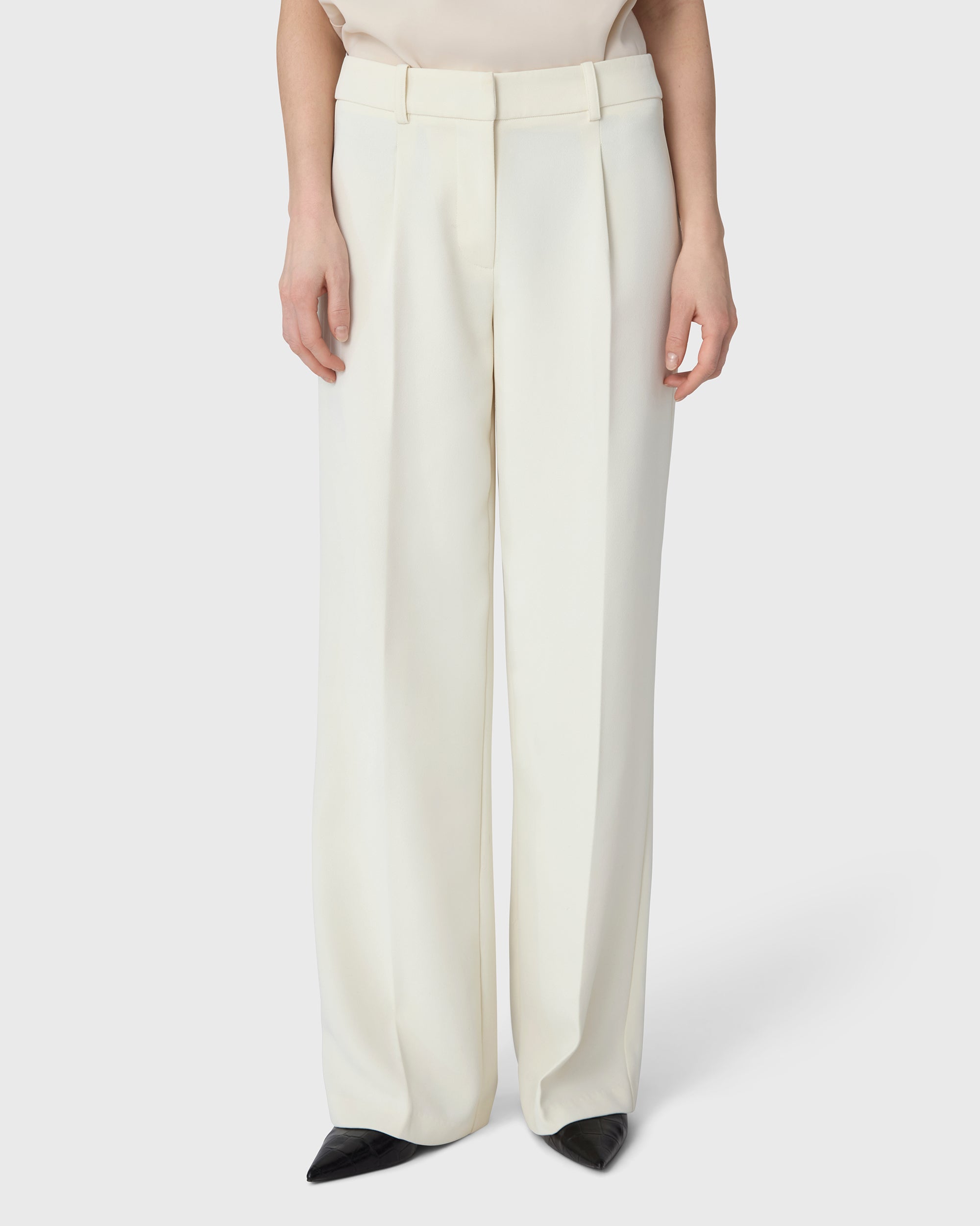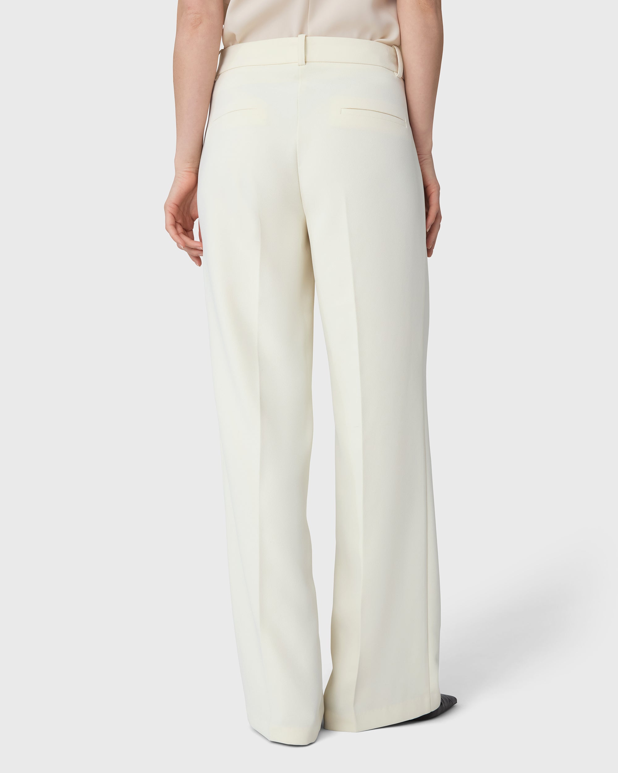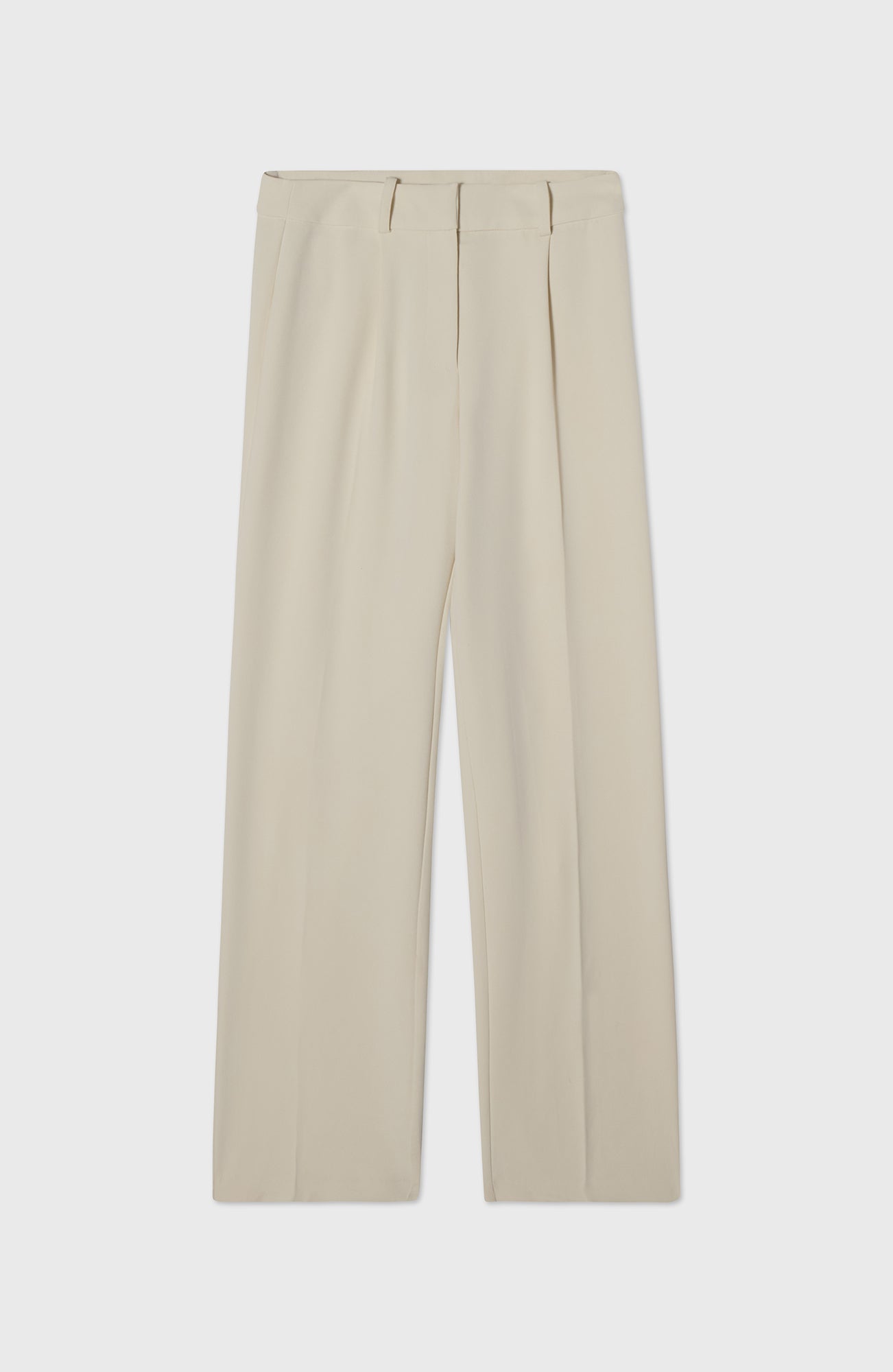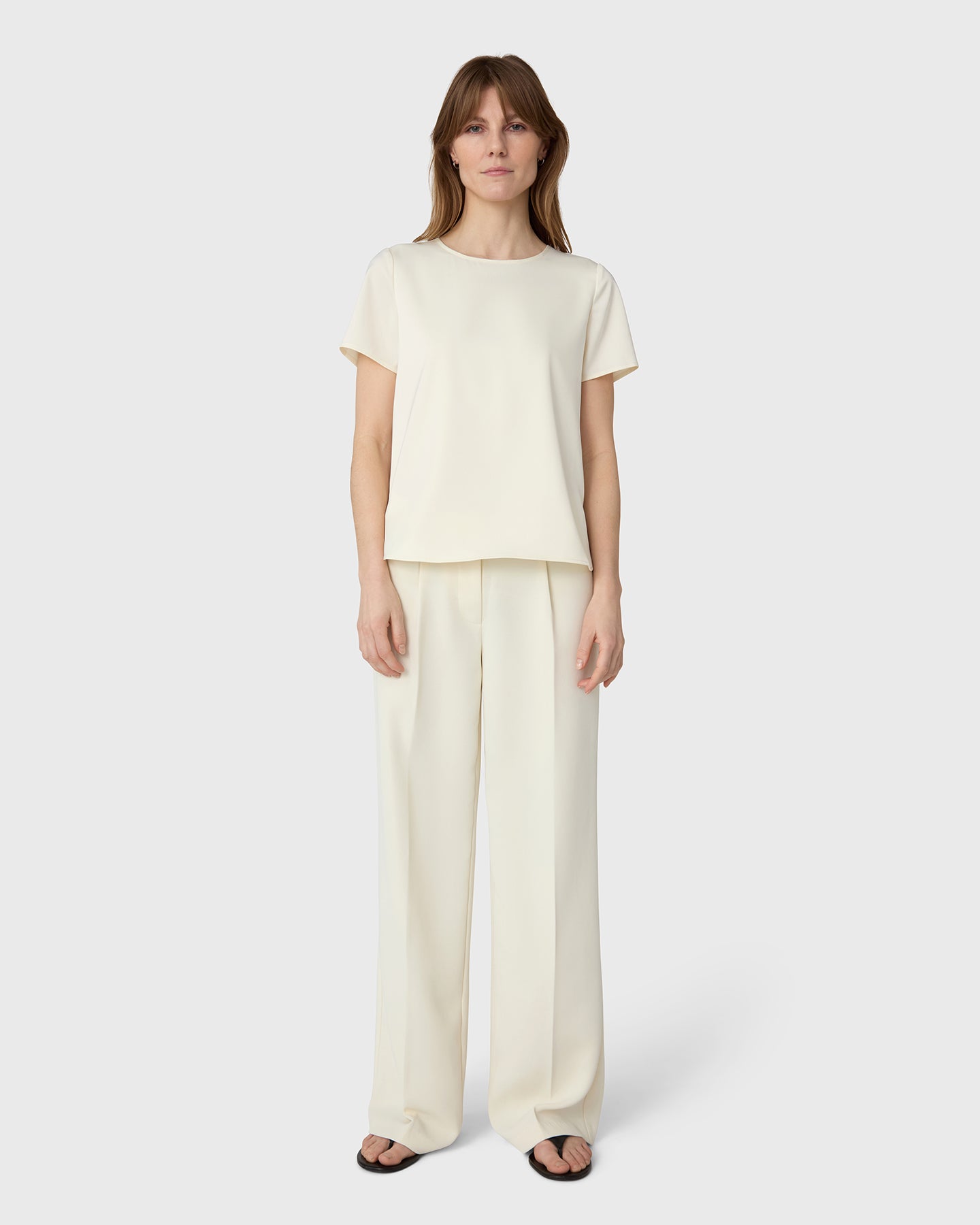 Tidlösa, vida byxor med noggrant placerade frontveck som skapar en ren och balanserad silhuett utan överflödig volym. Tillverkade i vårt signaturmaterial heavy stretch crepe – ett maskintvättbart tyg med vacker tyngd, följsamt fall och naturlig motståndskraft mot skrynklor. Ett par cremefärgade byxor att bära genom säsonger, år efter år.