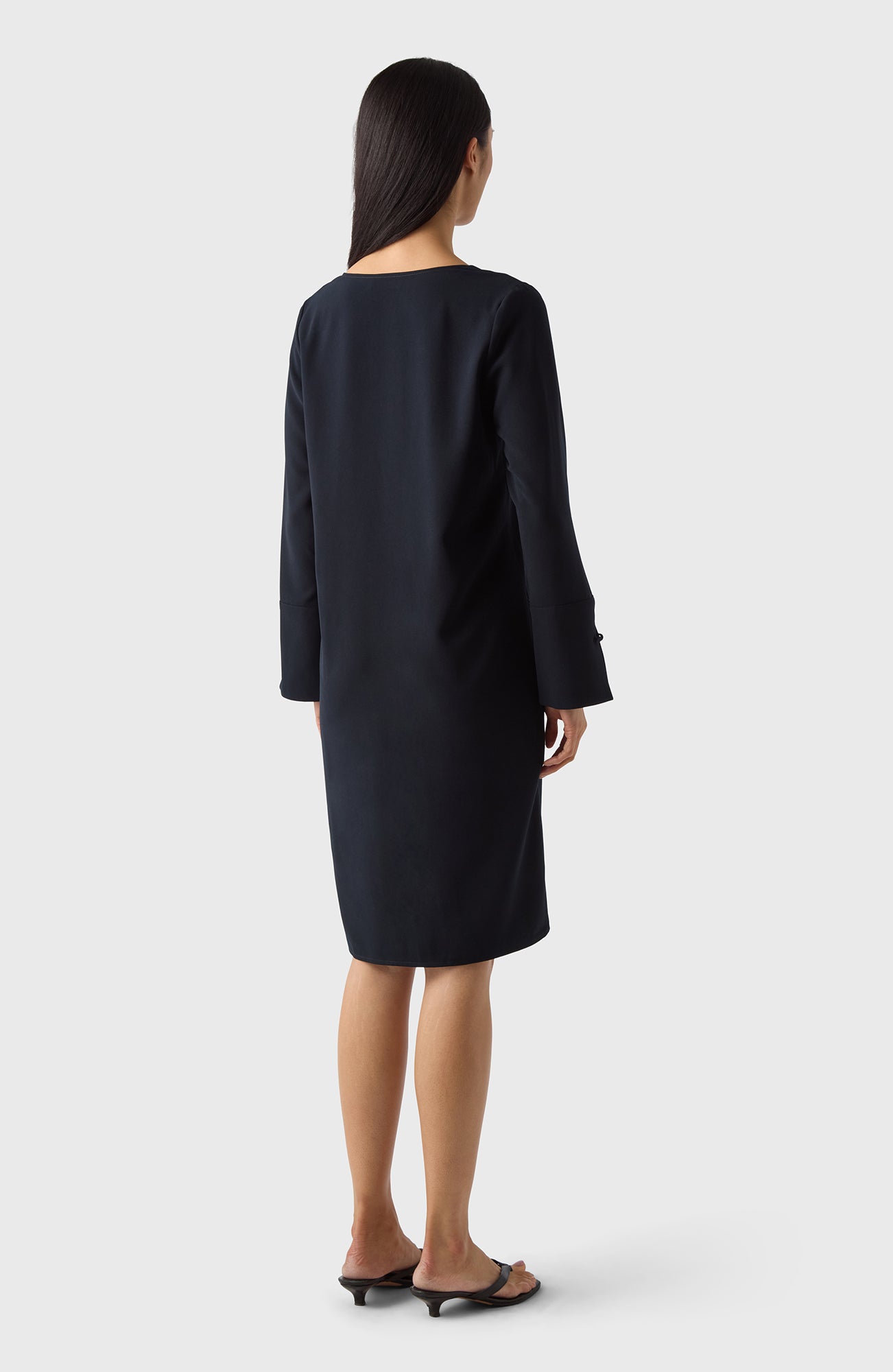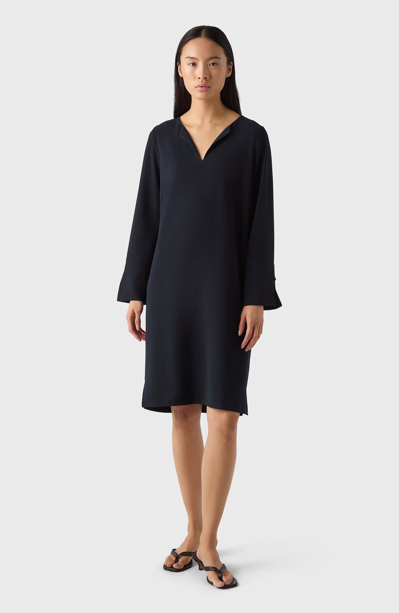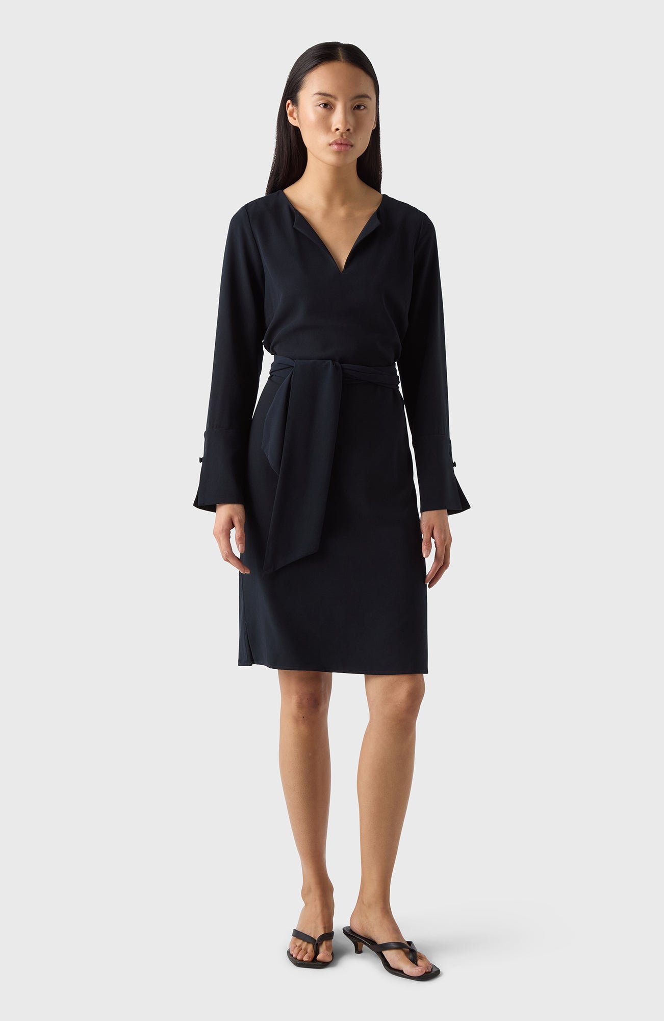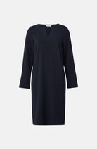 Klänning med halv V-ringning, långa ärmar med stora manschetter och tygklädda knappar. Efva är den perfekta vardagsklänningen, lämplig för alla tillfällen. Bär den som den är eller knyt åt med bältet för en feminin siluett.