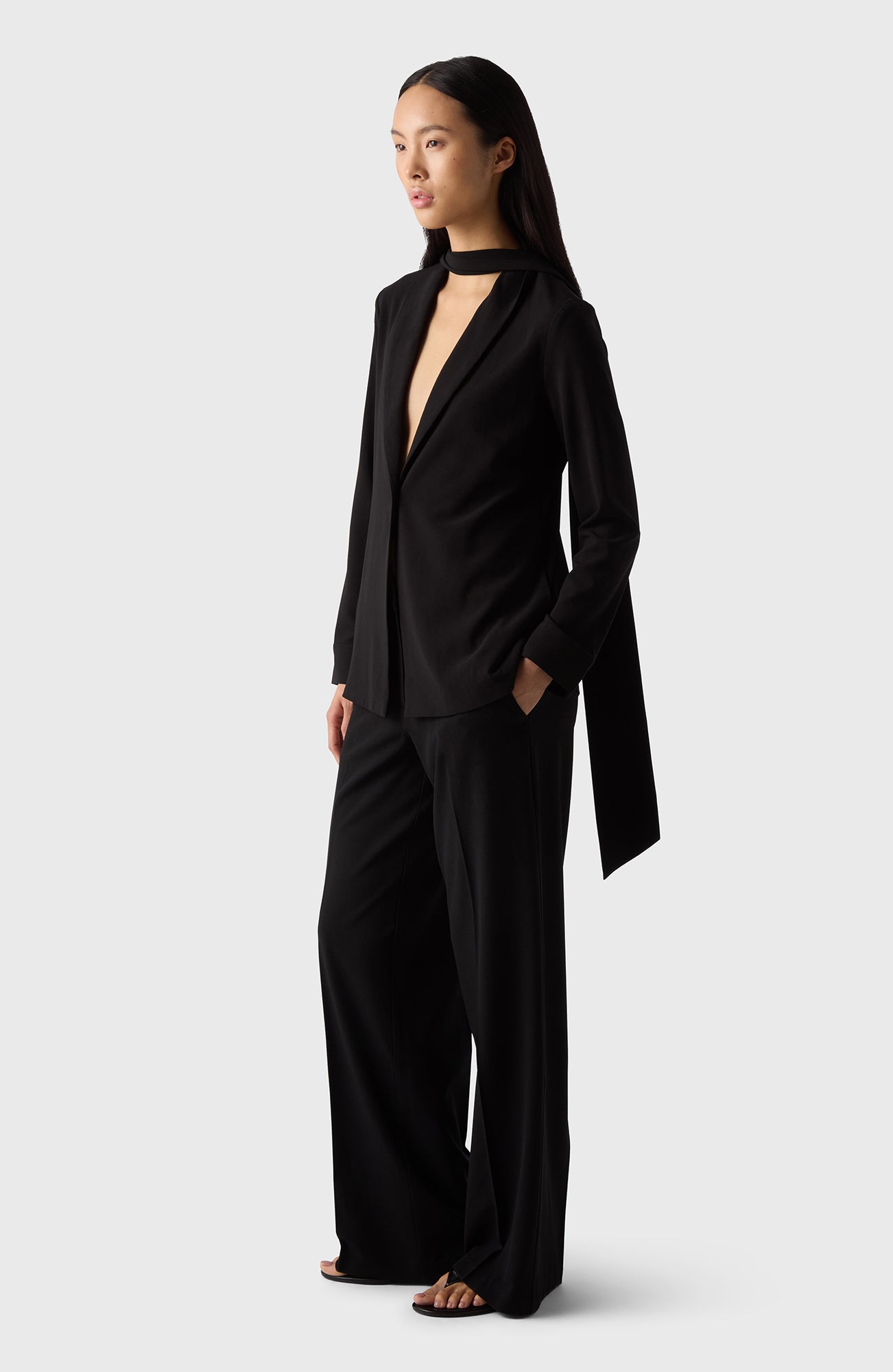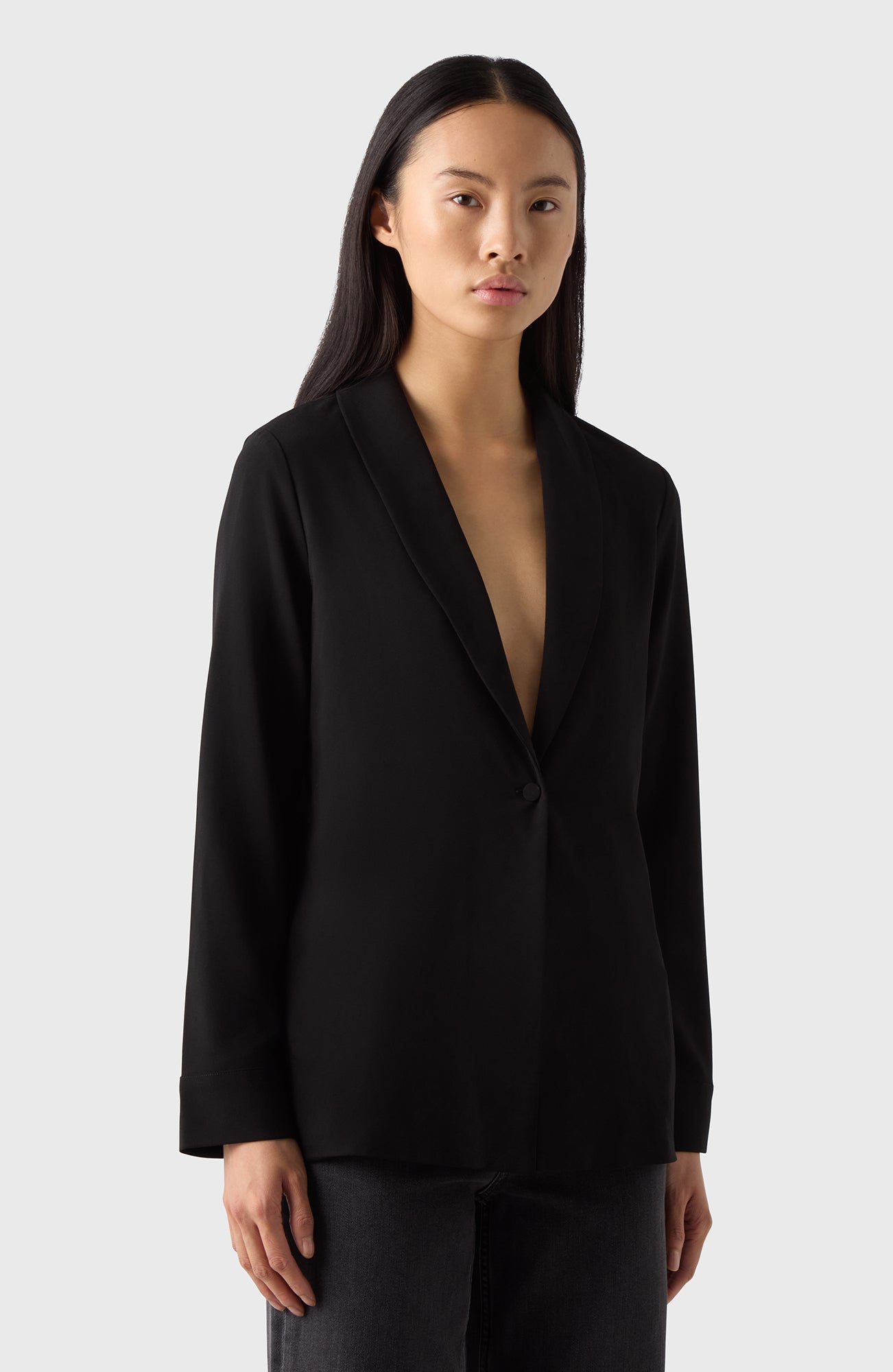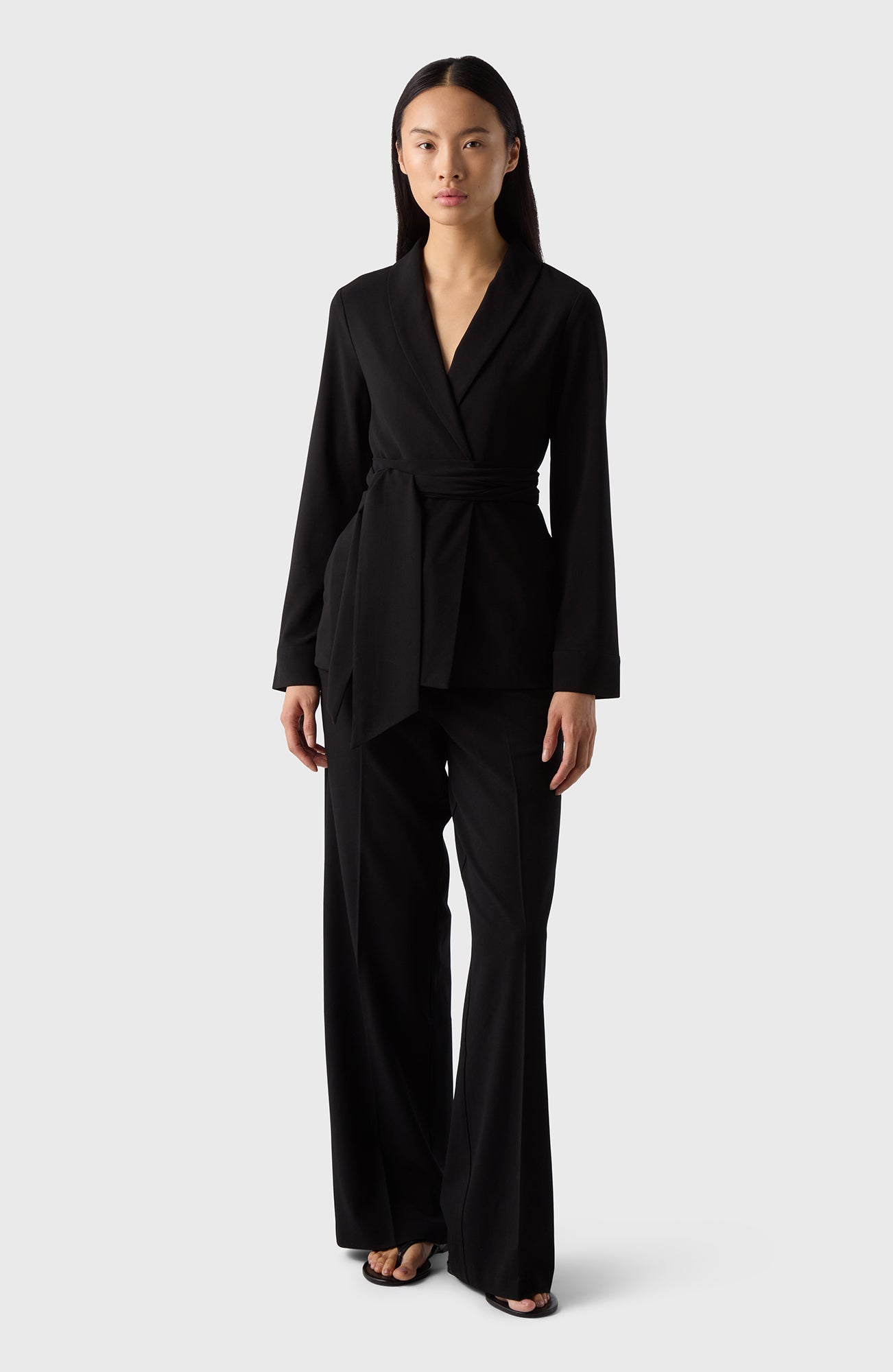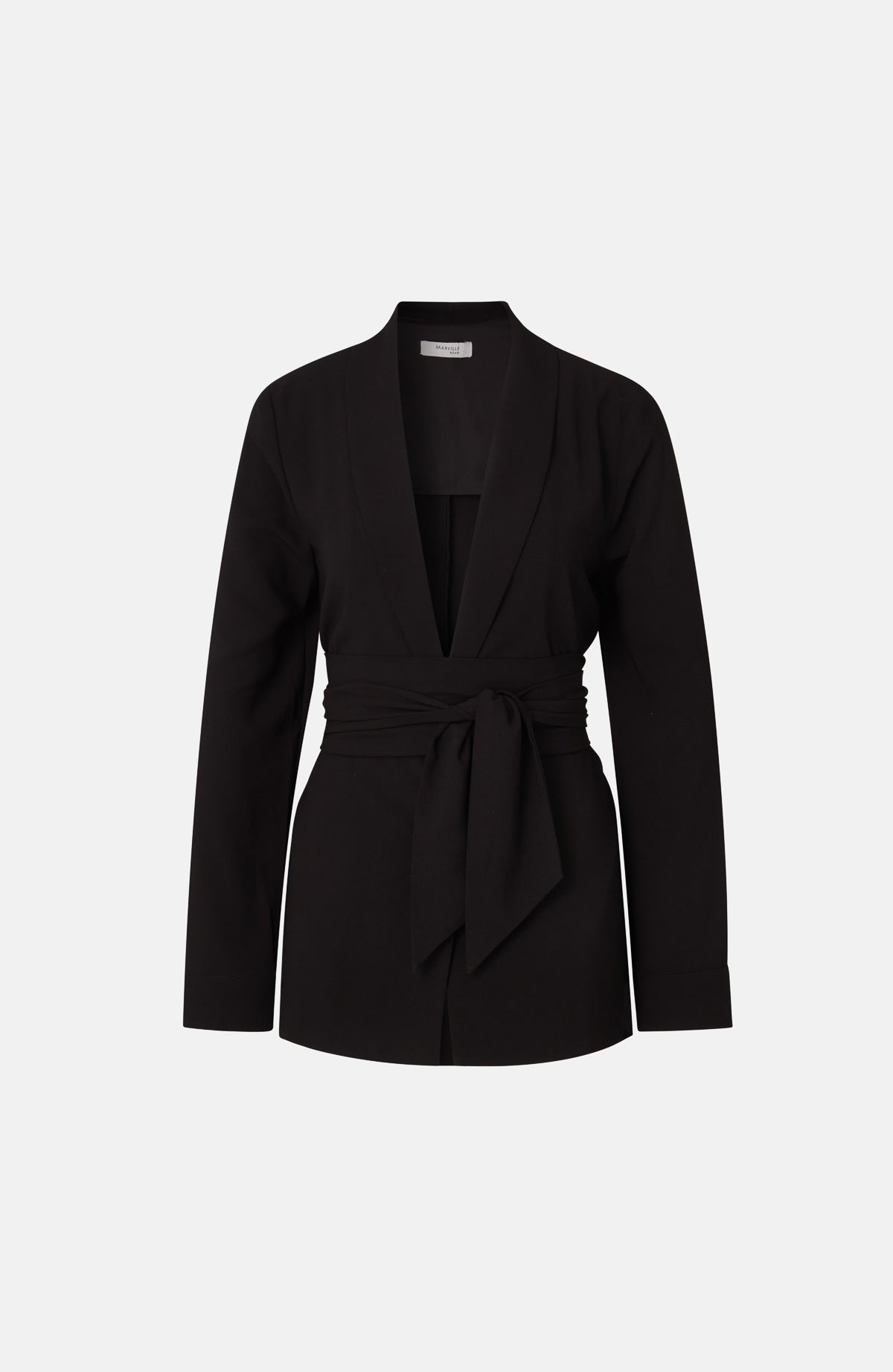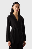 Varje garderob behöver en lätt och elegant kavaj som denna. Den kan bäras knäppt eller omlott och är gjord av ett mjukt crêpe-tyg. Kommer med ett tillhörande sjal/bälte.