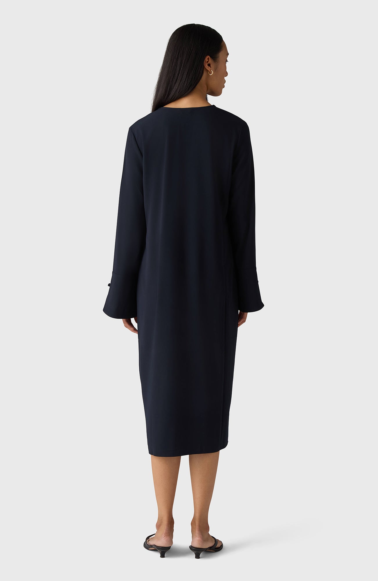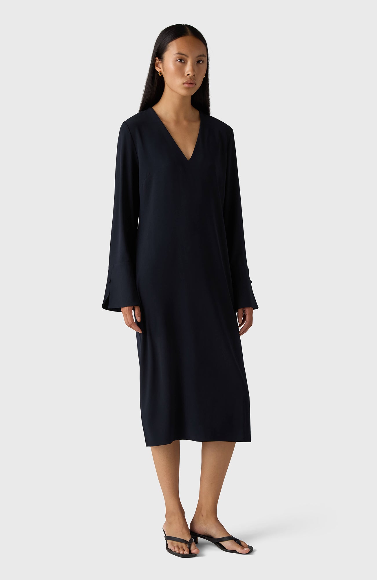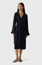Kate-klänningen är en midiklänning med V-ringning som har långa ärmar med manschetter och levereras med ett tillhörande bälte för att framhäva din siluett.